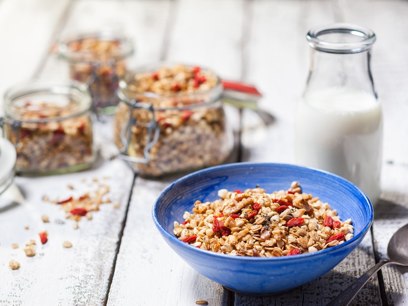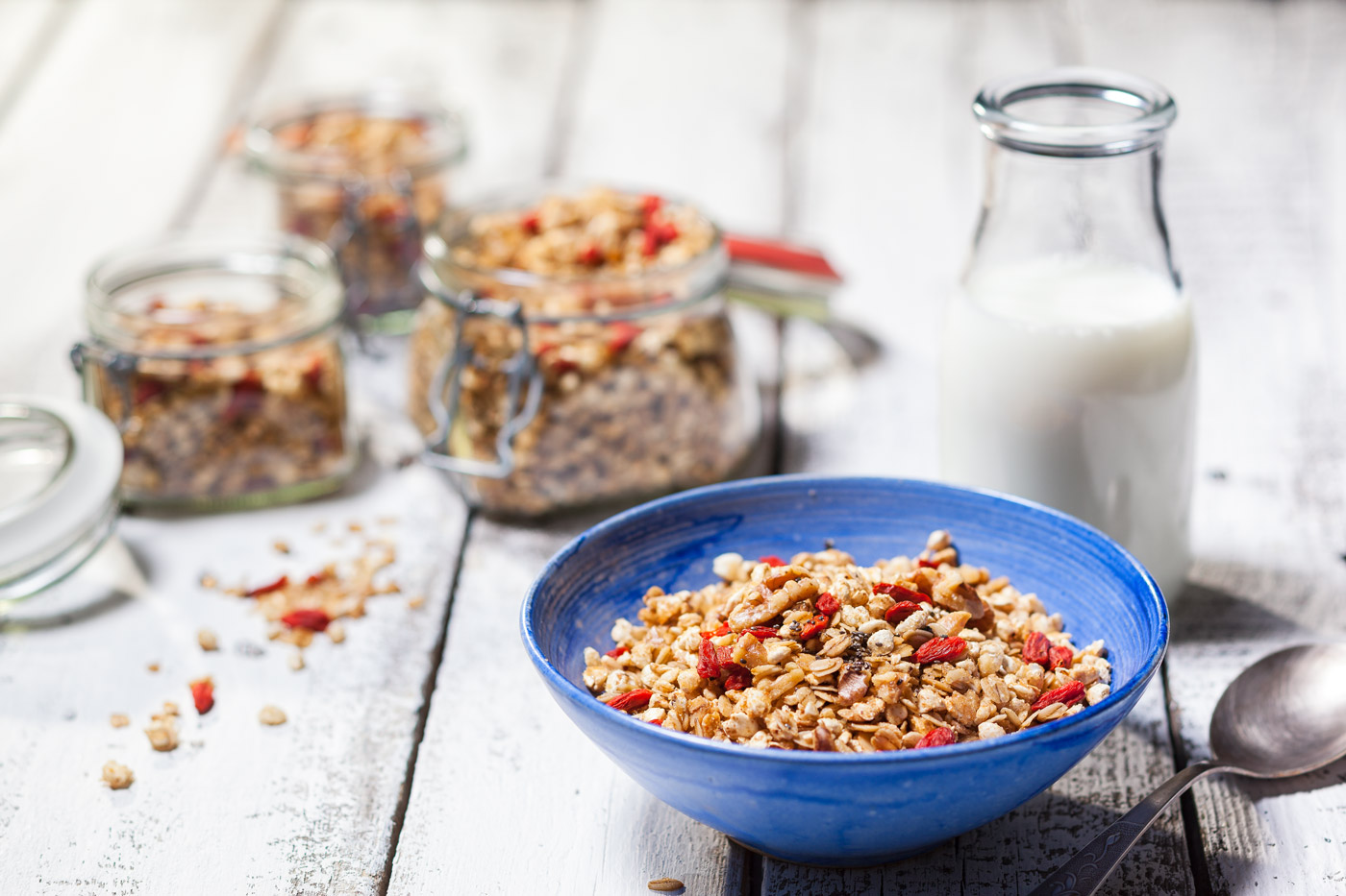 Dalším oblíbeným snídaňovým tipem je klasický bílý jogurt s musli či granolou. Tu chystáme vždy ve větším množství, zabere to už trochu času, tak, ať ji máme do zásoby. Na plechu s trochou oleje opražíme vločky (většinou nějakou směs ovesných, špaldových, jednozrnkových a pohankových), asi po dvaceti minutách přidáme další ingredience – ořechy, semínka, kokos, čokopecičky, sušené ovoce, rozinky a přilijeme sirup či med vše promícháme a ještě pečeme při nízké teplotě asi 15 minut, aby se jednotlivé suroviny pěkně spojily a dostaly příjemnou křupavou strukturu.
