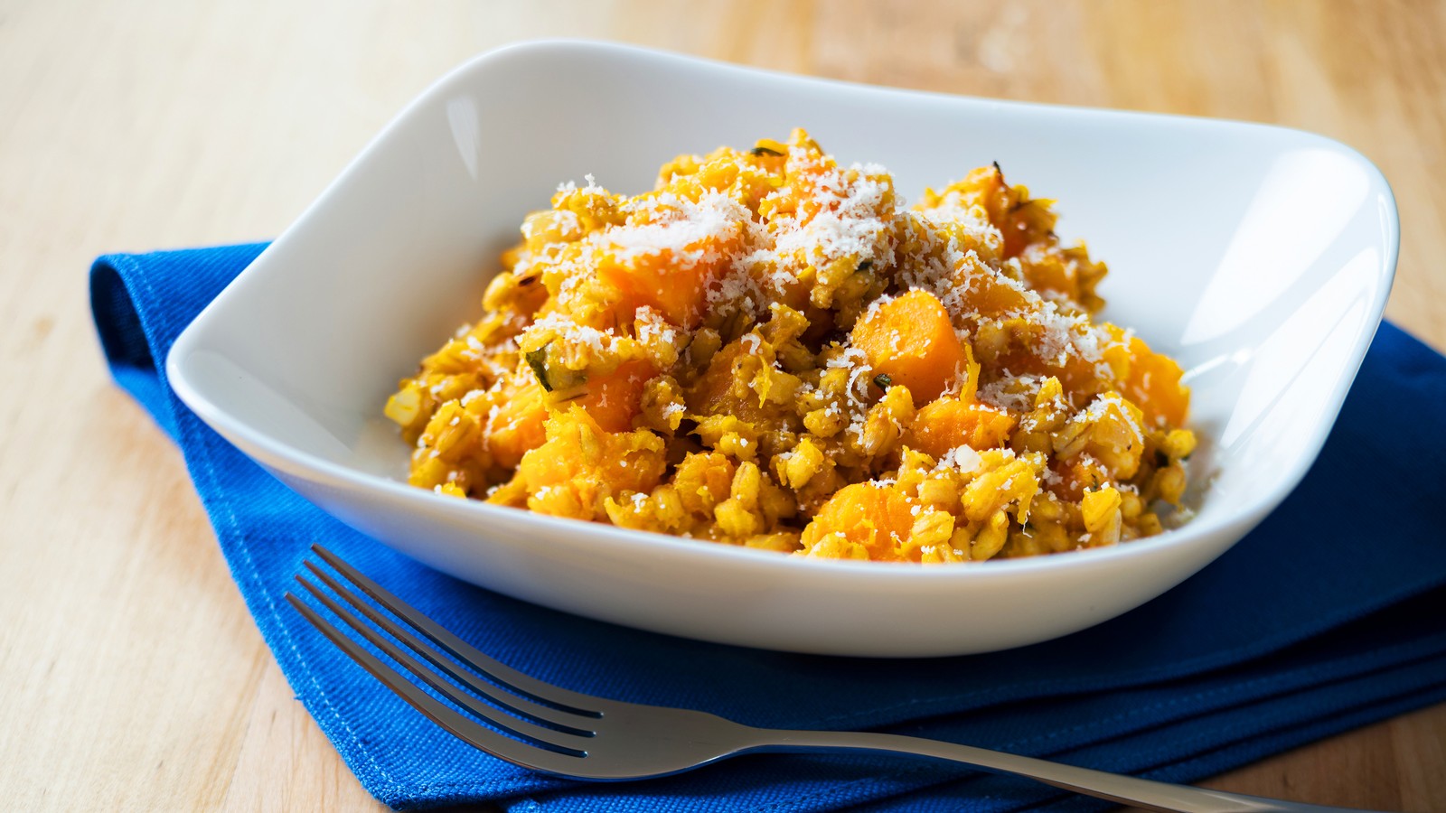 Šalotku orestujte na másle, přidejte šalvěj nakrájenou na proužky a nechte 3 minuty podusit. Přidejte uvařené kroupy a dýňové pyré. Vmíchejte nastrouhaný parmazán a nakonec máslo.