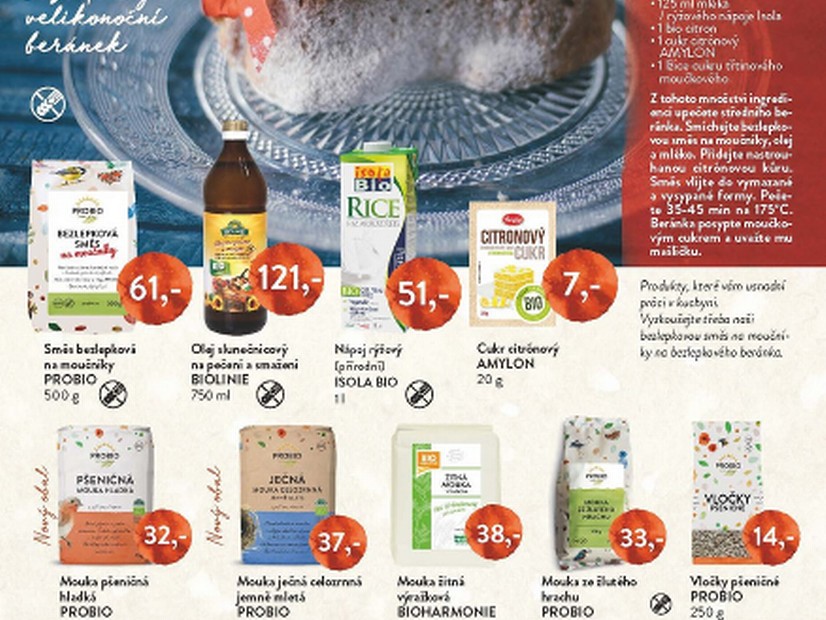 Neodmyslitelnou součástí sváteční velikonoční tabule symbol beránka. Pokud se letos chcete vyhnout nadbytku lepku nebo jen zkusit nové chutě, máme pro vás tip na beránka z bezlepkové směsi na moučníky. Směs jsme pro vás namíchali z čerstvě namletých mouk z našeho bezlepkového bio mlýna – pohankové, čirokové, kukuřičné, rýžové a cizrnové. Ke směsi již nemusíte přidávat kypřicí prášek ani ji sladit, již jsme ji doplnili o vinný kámen i tmavý třtinový cukr. Směs jsme navíc obohatili o psyllium a lněné semínko, které mají blahodárný vliv na trávení.