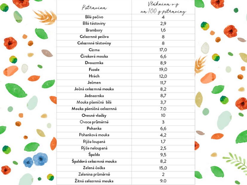 Významné množství vlákniny obsahuje nejen ovoce a zelenina, ale především celozrnné obiloviny a luštěniny, ořechy a semínka. Celozrnné pečivo a těstoviny, různé kroupy či rýže natural jsou v porovnání se zeleninou na vlákninu podstatně bohatší. Vybírejte ty celozrnné produkty, které jsou opravdu celozrnné, ne jen tmavě obarvené, protože právě v obalu zrna je nejvíce vlákniny. Celozrnné pečivo musí obsahovat minimálně 80 % celozrnné mouky. A ještě jedna důležitá informace. V obalové vrstvě zrna se bohužel mohou vyskytnout zbytky pesticidů z průmyslového zemědělství, proto doporučujeme kupovat produkty v biokvalitě, u kterých se žádné nežádoucí chemické přípravky nepoužívají.