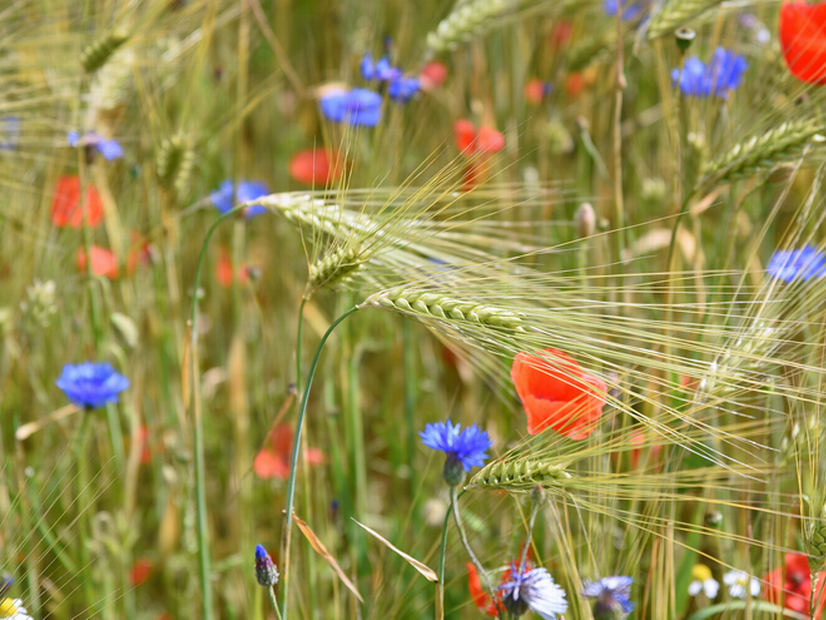 Ječmen, pšenice s polními plevely chrpou a vlčím mákem – pestrou