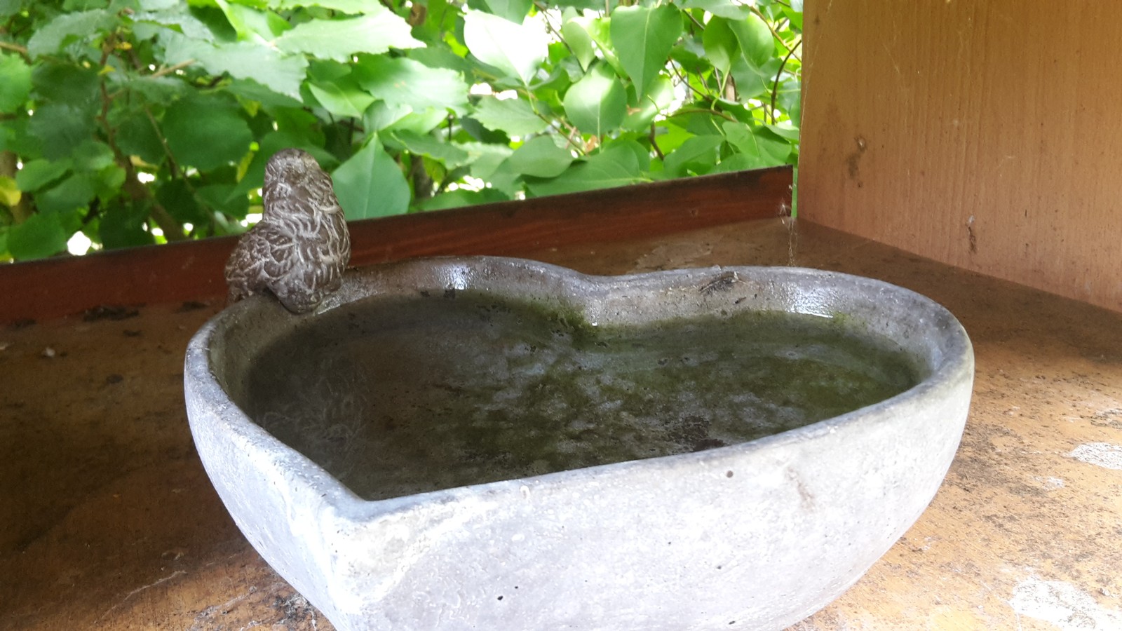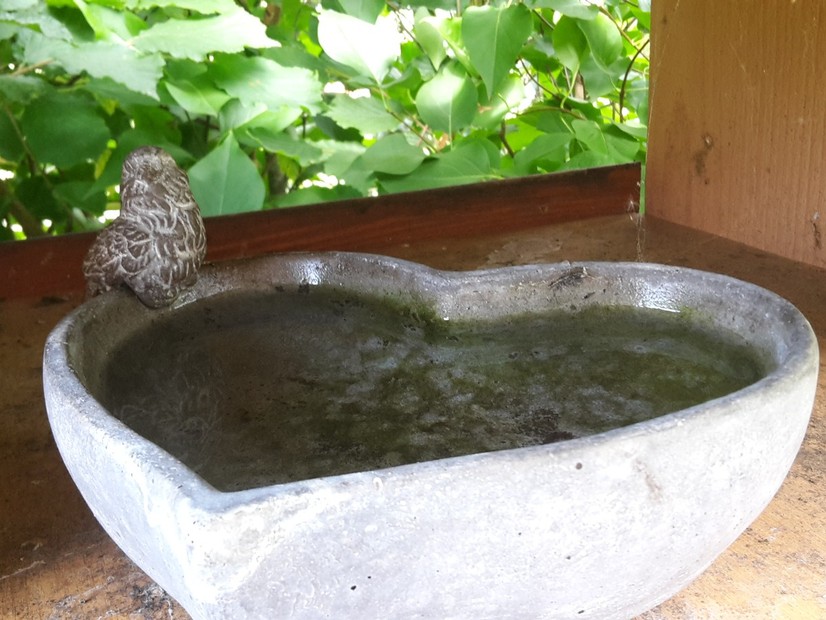 Nezapomeňme během horkých letních měsíců rozmístit po zahradě pro její obyvatele různá pítka. Ptáčkům postačí keramická miska s vodou, motýlům připravme talíř s vodou a kamínky a včelkám mokrý mech, do něhož otočíme dnem vzhůru skleněnou lahev s děrovaným víkem, takže voda z ní bude pozvolna vytékat.