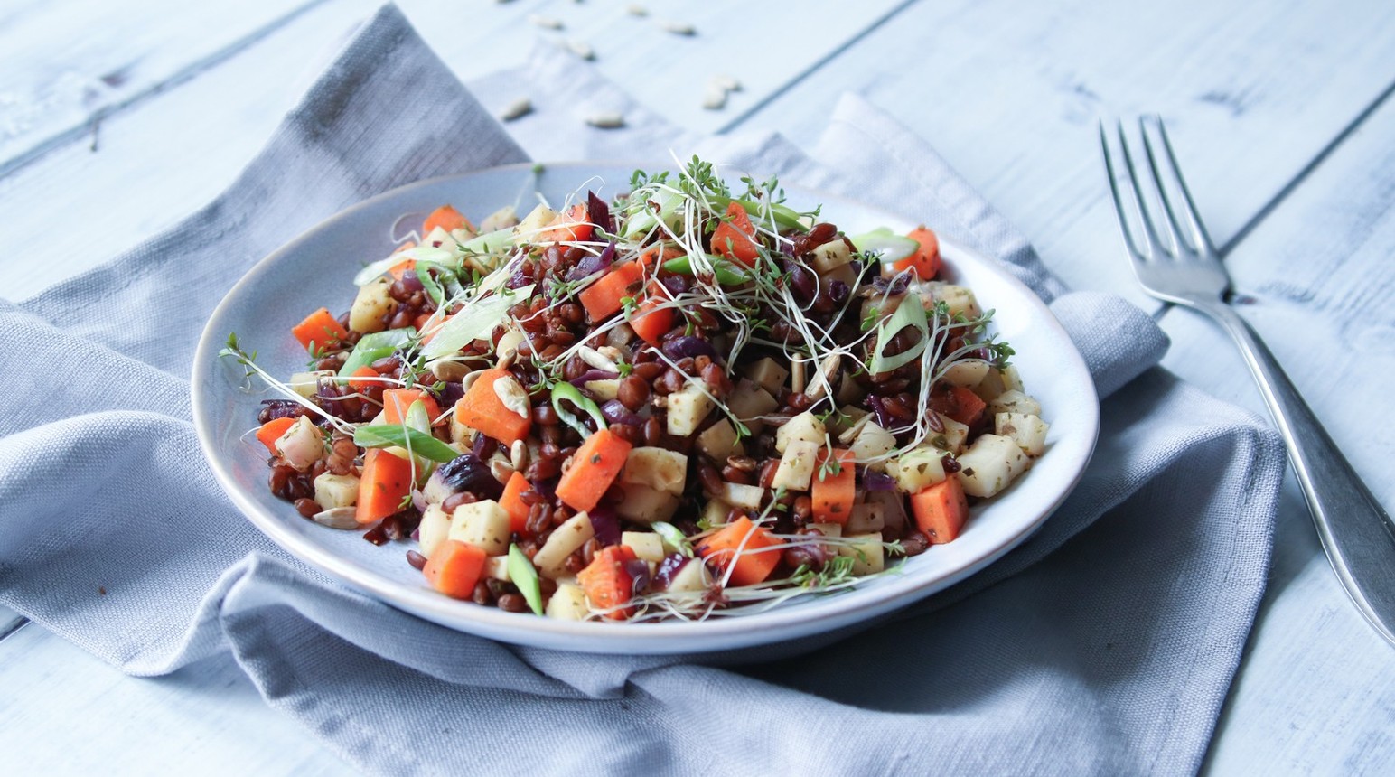 Cibuli nakrájejte nadrobno. Ve velké pánvi rozehřejte olej a cibuli zpěňte. Kořenovou zeleninu nakrájejte na malé kostičky a přidejte k cibuli. Opékejte, dokud trochu nezměkne. K zelenině přidejte kmín, zalijte ume octem, přidejte majoránku, lehce osolte a opepřete. Přidejte scezenou pšenici a promíchejte.