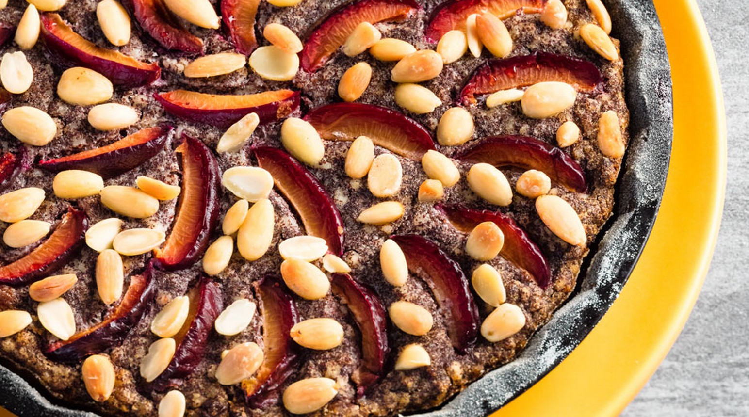 Těsto nalijte do formy, ozdobte švestkami a loupanými mandlemi. Pečte cca 45 minut.