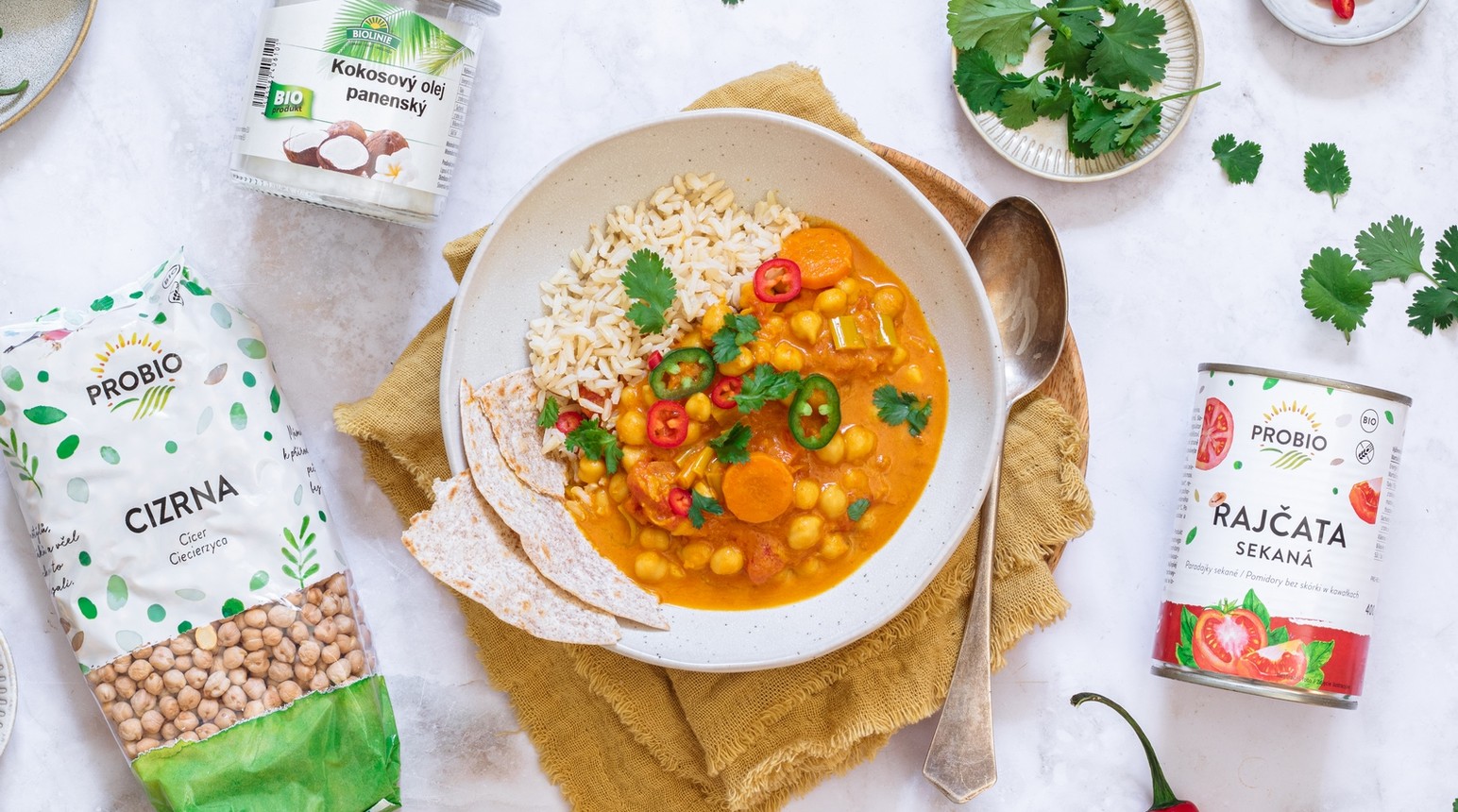 Po 10 minutách osolte, přidejte na kolečka nakrájenou mrkev a pórek. Zalijte kokosovým mlékem, zamíchejte a vařte dalších 15 minut, vmíchejte uvařenou cizrnu.