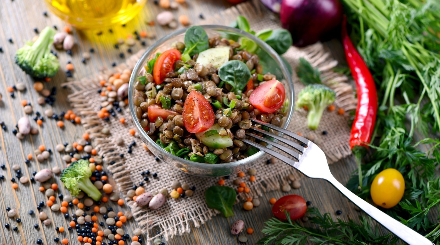 Čočku uvaříte v jednom hrnci, dle návodu, čirok a cizrnu v druhém, (aby nedošlo k vzájemnému zabarvení luštěnin). Červenou řepu uvaříte do měkka, oloupejte a nechte vychladnout. Papriky nakrájejte na kostičky, osolte, zlehka osmažte na olivovém oleji, přidejte prolisovaný česnek, lžíci balsamica a ještě krátce dosmažte. Červenou řepu oloupejte a nakrájejte na kostičky, nasekejte petržel, najemno nakrájejte cibuli. Do uvařených luštěnin přidejte červenou řepu, osmažené papriky s česnekem, cibuli, petržel, koření a sůl, důkladně promíchejte a servírujte. Můžete ozdobit lísky čerstvé petržele nebo koriandru.