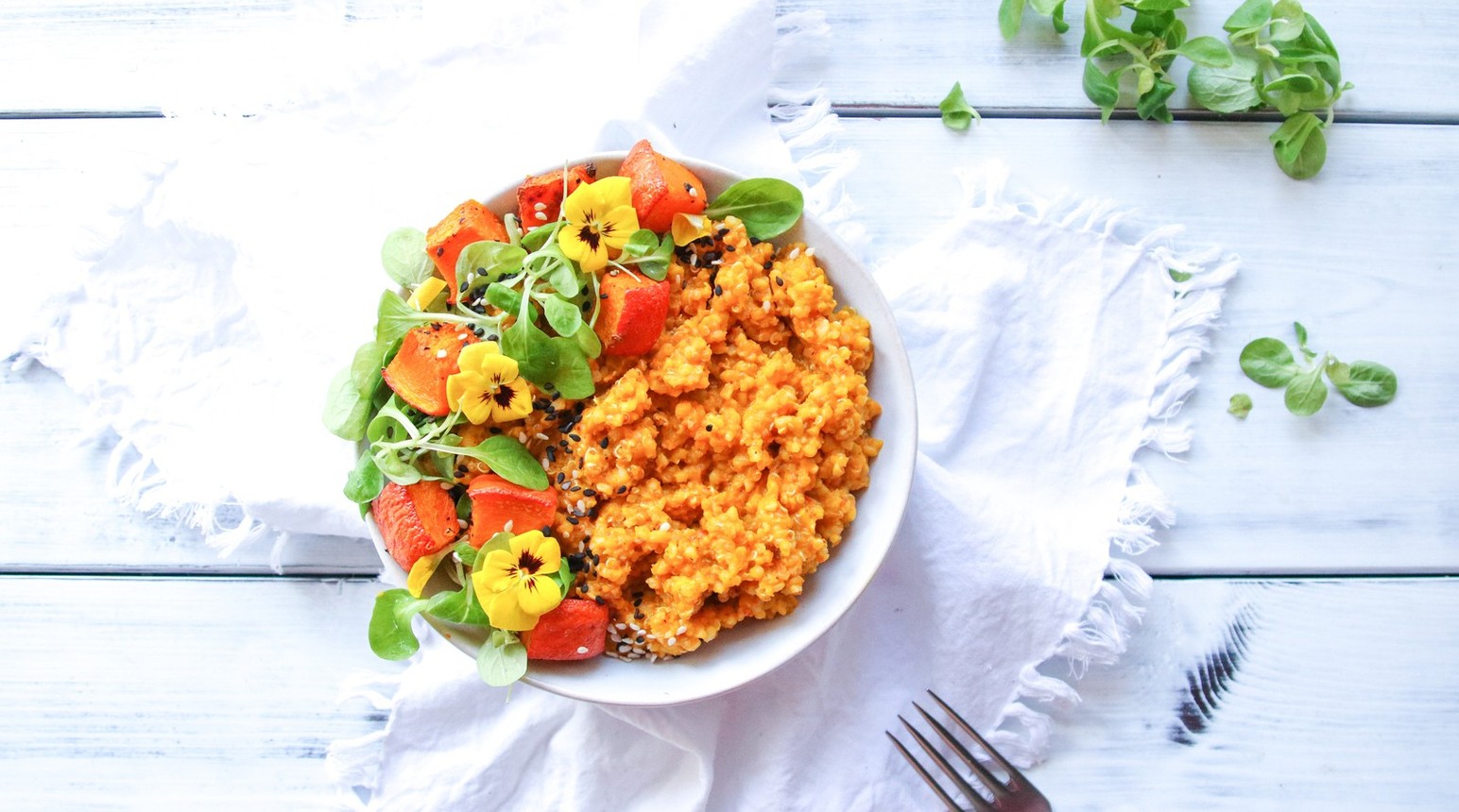 Dýni nakrájejte na menší kusy a v míse promíchejte se lžící oleje, osolte a opepřete. Rozprostřete dýni na plech vyložený pečicím papírem a vložte do trouby vyhřáté na cca 170 °C. Pečte doměkka. Dýni s kokosovým mlékem, římským kmínem a trochou chilli rozmixujte najemno. Pyré smíchejte s bulgurem a quinoou.