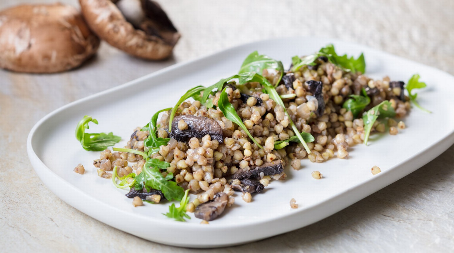 Houbovou směs smíchejte s pohankou a dochuťte solí a pepřem. Nakonec vmíchejte rukolu, která jídlu dodá charakteristickou chuť.