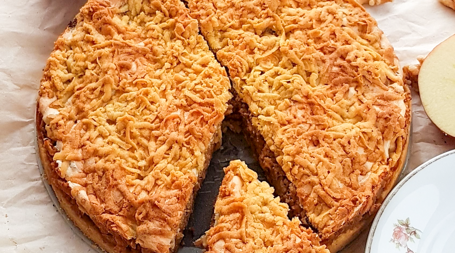 Z mouky, 50 g cukru, másla s žloutků zpracujte těsto, 1/3 dejte do lednice ztuhnout. Zbytek rozprostřete do formy, poklaďte nastrouhanými jablky, posypejte skořicí, ořechy a rozinkami.