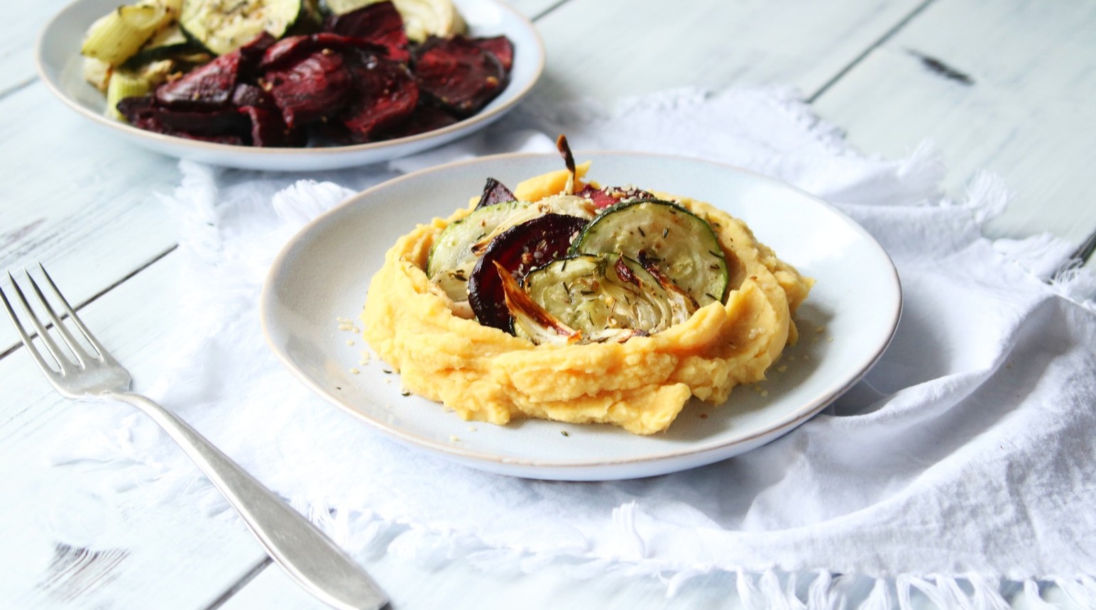Než se uvaří hrachové pyré, dejte si péct zeleninu. Oloupanou červenou řepu nakrájejte na slabé rovnoměrné plátky (maximálně 0,5 cm). Ty vyskládejte na plech vyložený pečicím papírem, pokapejte olivovým olejem, osolte a opepřete.