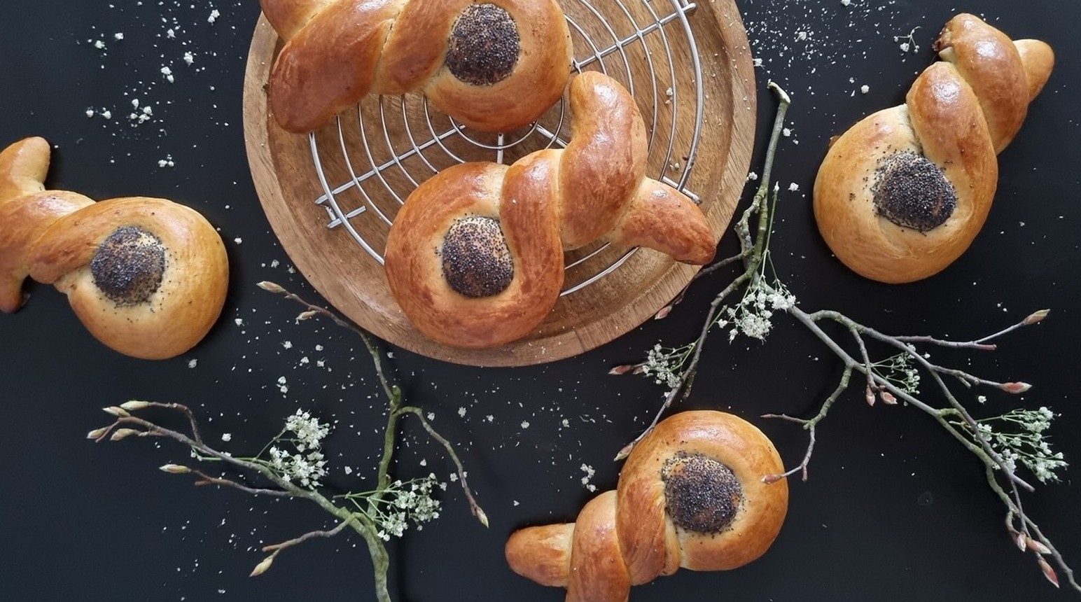 Vezměte si malou 10 g kuličku - tu zlehka namočte do vody a vyválejte v nemletém máku. A máte připravené obě části zajíce. Vemte naplněnou část, položte ji na plech s peč. papírem a stočte do písmene U, do spodní části položte kuličku s mákem (je to vlastně ocásek zajíce) a následně zamotejte zajíce. Takto postupujte u všech 11 kousků.
