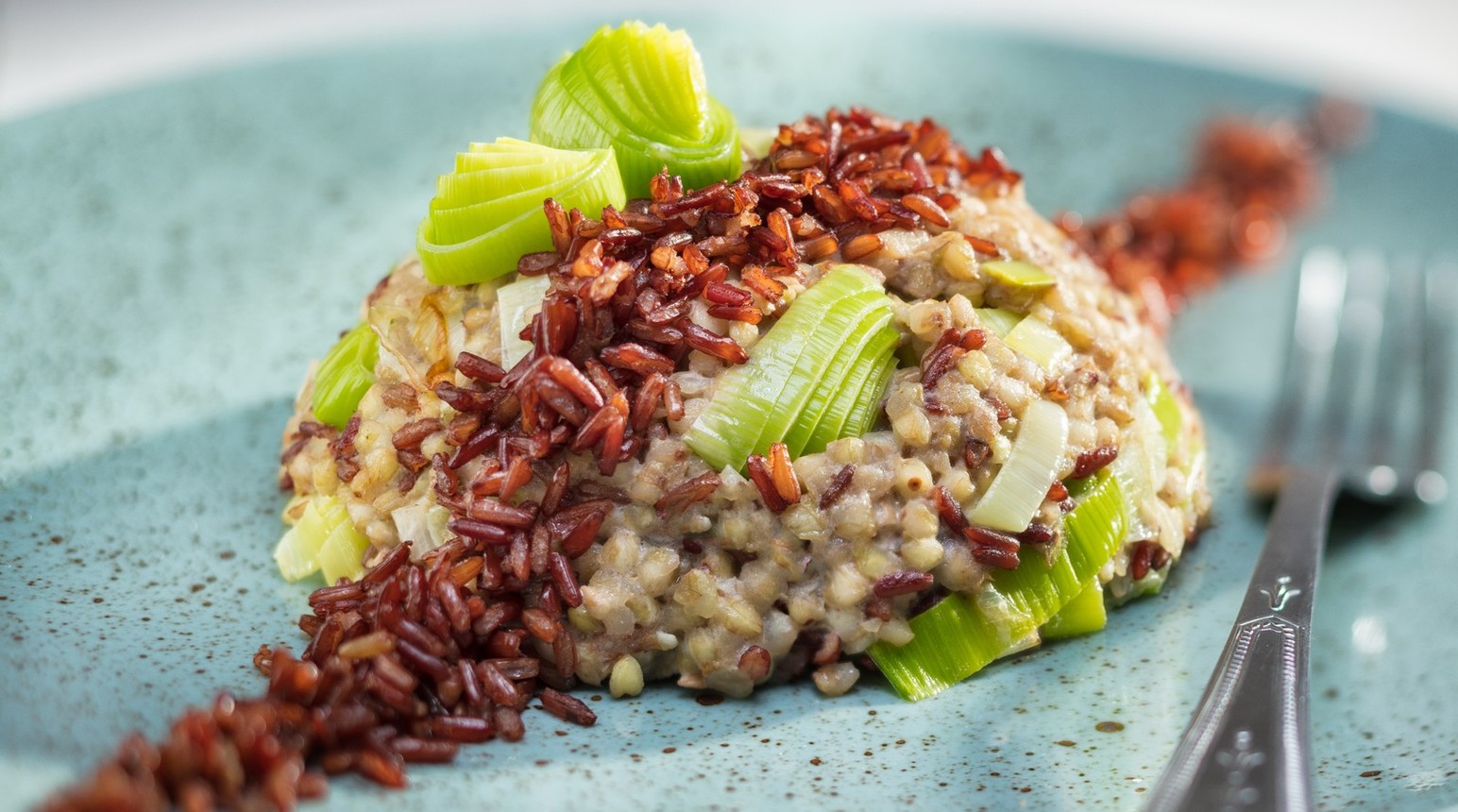 Na másle zpěňte na kolečka nakrájený pórek, přidejte uvařenou pohanku, červenou rýži a rýžový krém, promíchejte a dochuťte Tamari omáčkou. Podávejte jako přílohu s masem nebo zeleninou.