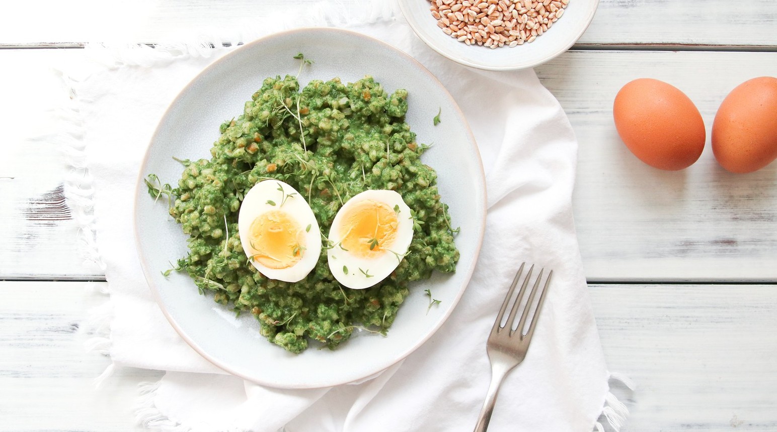 Přendejte špenát do mísy, přidejte krémový sýr a rozmixujte. Promíchejte s kroupami.