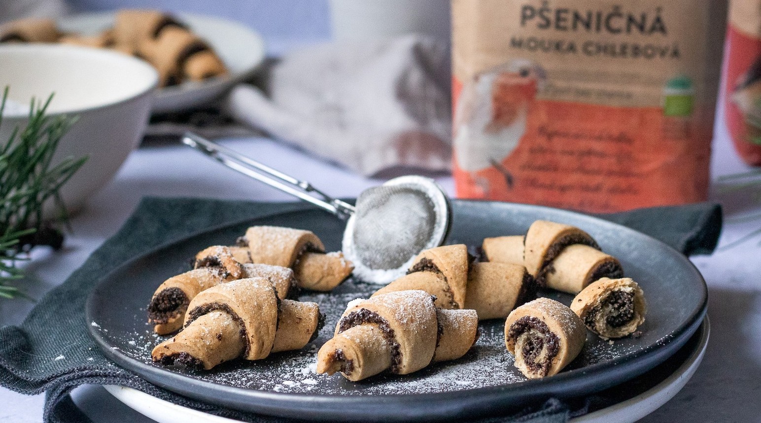 Těsto rozválejte na tenký obdélník široký asi 12 cm. Potřete rovnoměrně makovou náplní. Podélně překrojte a z každého pruhu těsta nakrájejte trojúhelníky o hraně asi 6 cm. Od širší strany ke špičce srolujte rohlíčky a přendejte na plech vyložený pečicím papírem.