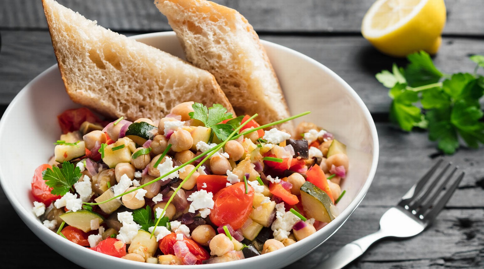 Zeleninu pečte na 220 ˚C asi 30 minut. Měla by být měkká, zlatavá, ale stále ještě lehce křupavá. Smíchejte suroviny na zálivku. Do ní přidejte pečenou zeleninou a cizrnu. Na závěr posypte salát balkánským sýrem a podávejte na čerstvé ciabatě.