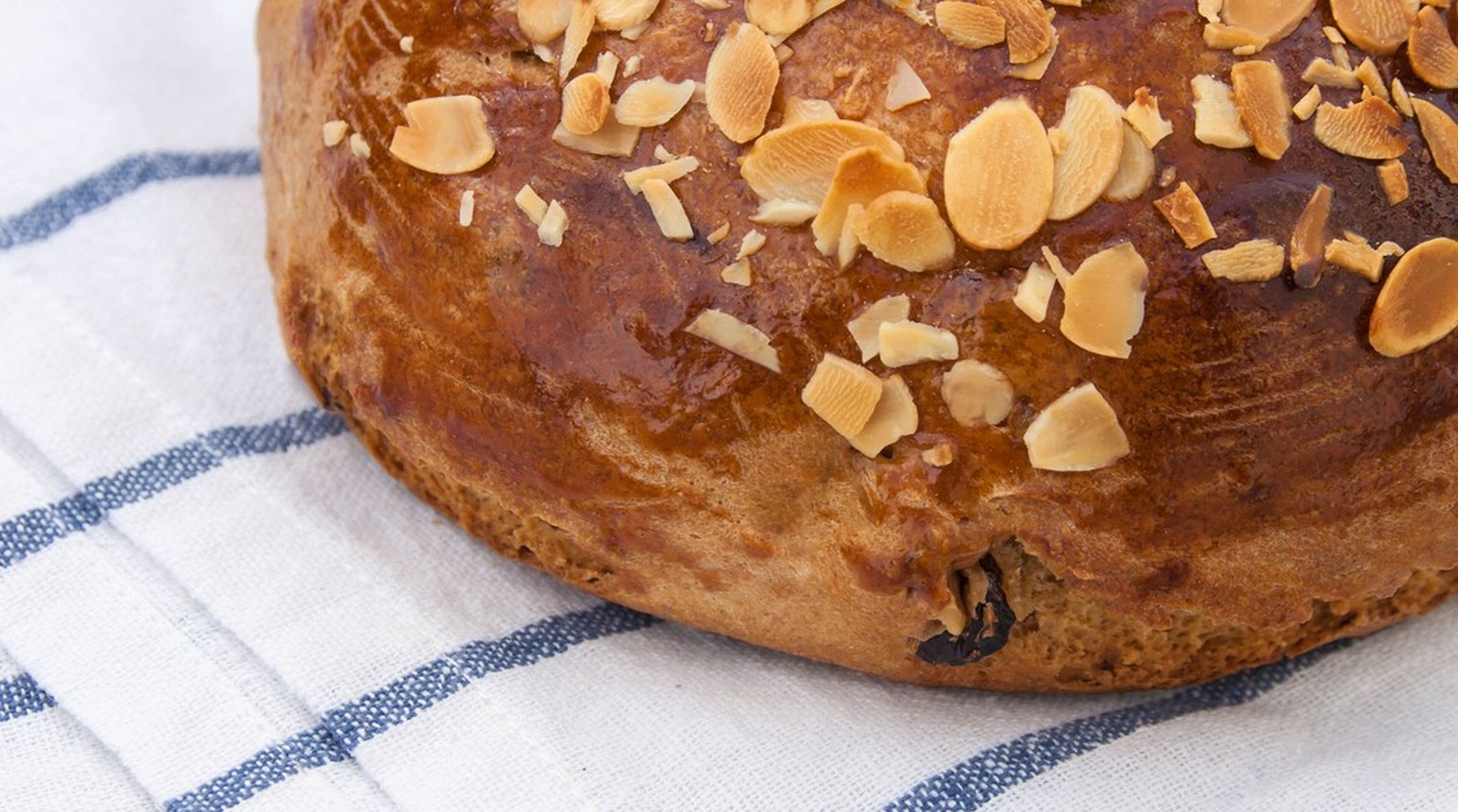 Z těsta vytvarujte bochánek a nechte na plechu vyloženém pečicím papírem ještě chvíli nakynout. Poté ho potřete bílkem a posypte oloupanými nasekanými mandlemi.