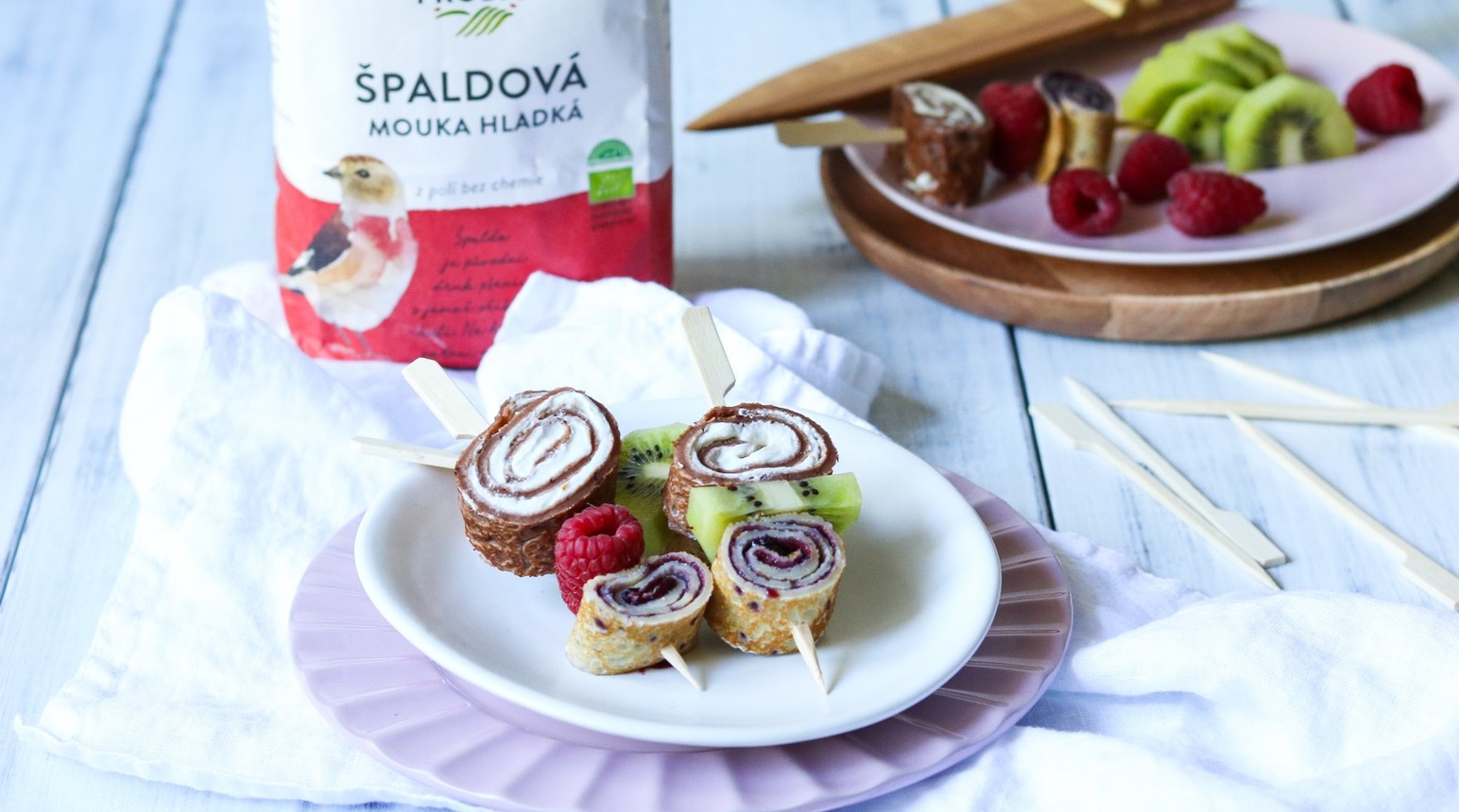 Palačinky s kakaem potírejte oslazeným tvarohem, světlé potřete džemem a stočte. Nakrájejte palačinky na 2-3 cm silné kousky.