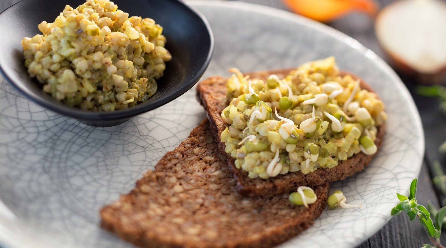 Pomazánku mažte ve vysoké vrstvě na kváskový chléb a posypte například naklíčeným mungem nebo vojtěškovými klíčky.