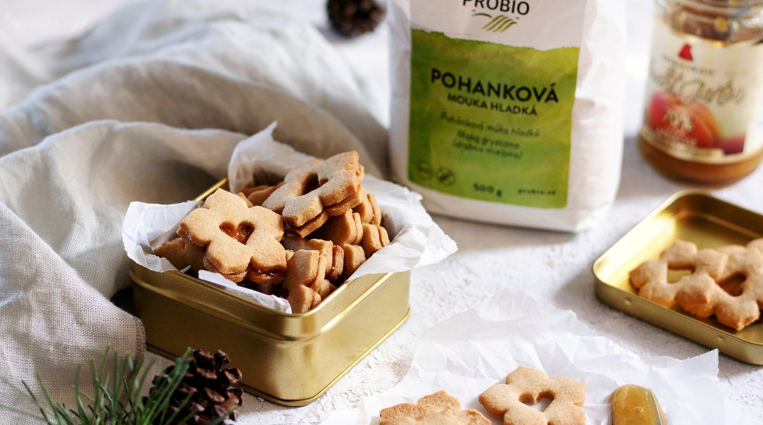 Z pohankové mouky, cukru, soli, másla a žloutku zpracujte těsto. Zabalte do potravinářské fólie a nechte v lednici uležet alespoň 2 hodiny.