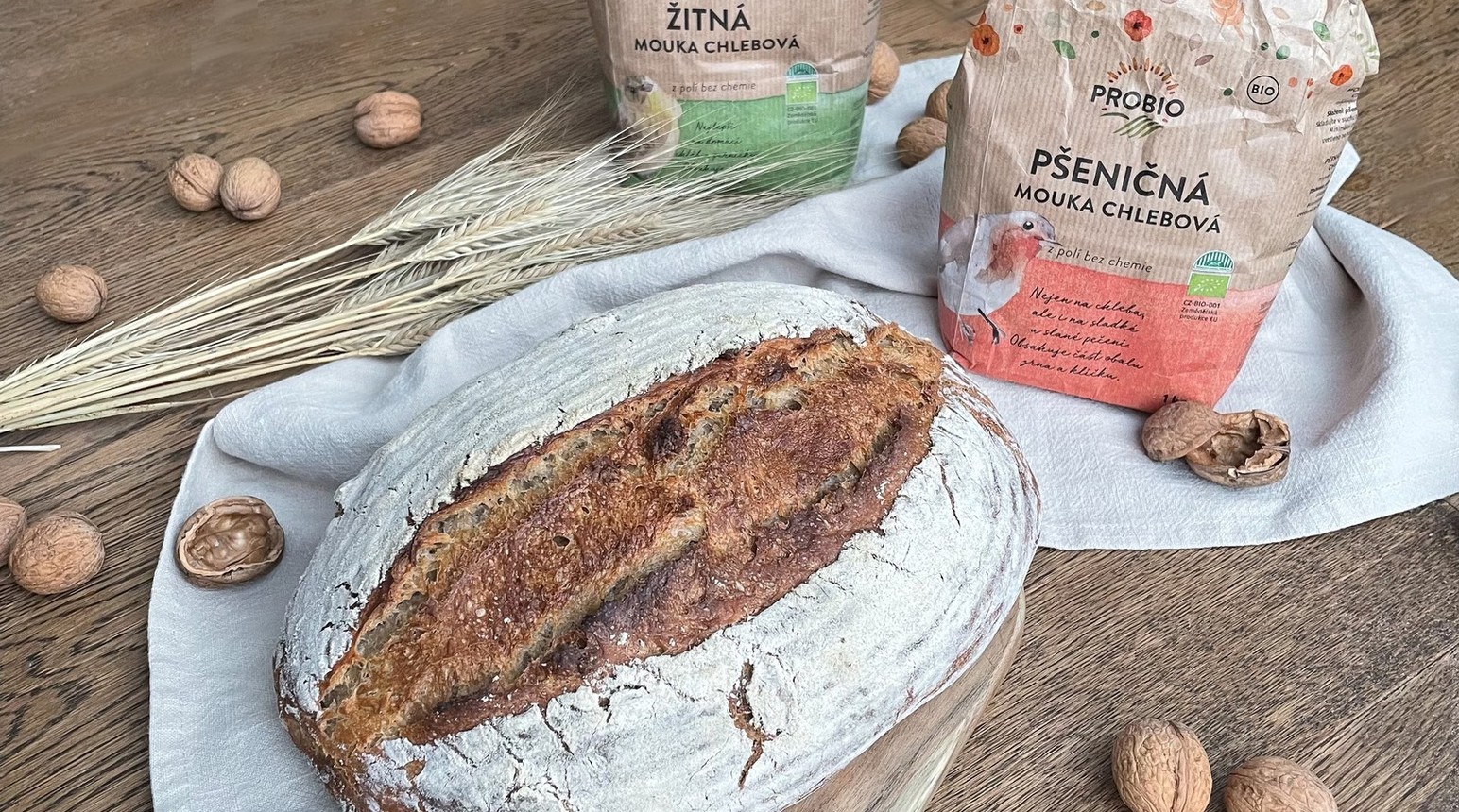 Těsto nechte v pokojové teplotě kynout cca 2-3 hodiny (přikryté v nádobě). Těsto by se mělo zvětšit o cca 80%. V průběhu kynutí těsto dvakrát přeložte, po cca 45 minutách. Po vykynutí stočte do ošatky a nechte cca 1,5 hodiny dále kynout (už nabyde jen o cca 20%). Po hodině kynutí rozpalte troubu (na 250°) s plechem na chléb a v nejspodnější části trouby umístěte nádobu nebo plech s vodu. Vykynutý chléb překlopte na plech do trouby, můžete jej předtím naříznout. Po 10 minutách vyndejte plech se zbytkem vody, troubu vyvětrejte a snižte teplotu na 220°. Pečte ještě cca 25 minut. Upečený chléb by měl na ťukání prstem dospod chleba „zvonit“.