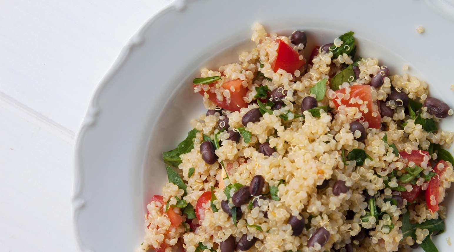 Do vroucí vody vložíme zeleninový bujón a quinou (poměr vody a quinoy je 2:1). Vaříme 15 minut, dokud se voda nevyvaří, poté necháme quinou ještě chvíli dojít pod pokličkou. Rajčata můžeme použít čerstvá nebo grilovaná v troubě nebo na pánvičce. Smícháme všechny ingredience na dresing, přidáme quinou, vychladlá rajčata, uvařené adzuki fazole a nasekanou rukolu. Vše řádně promícháme.