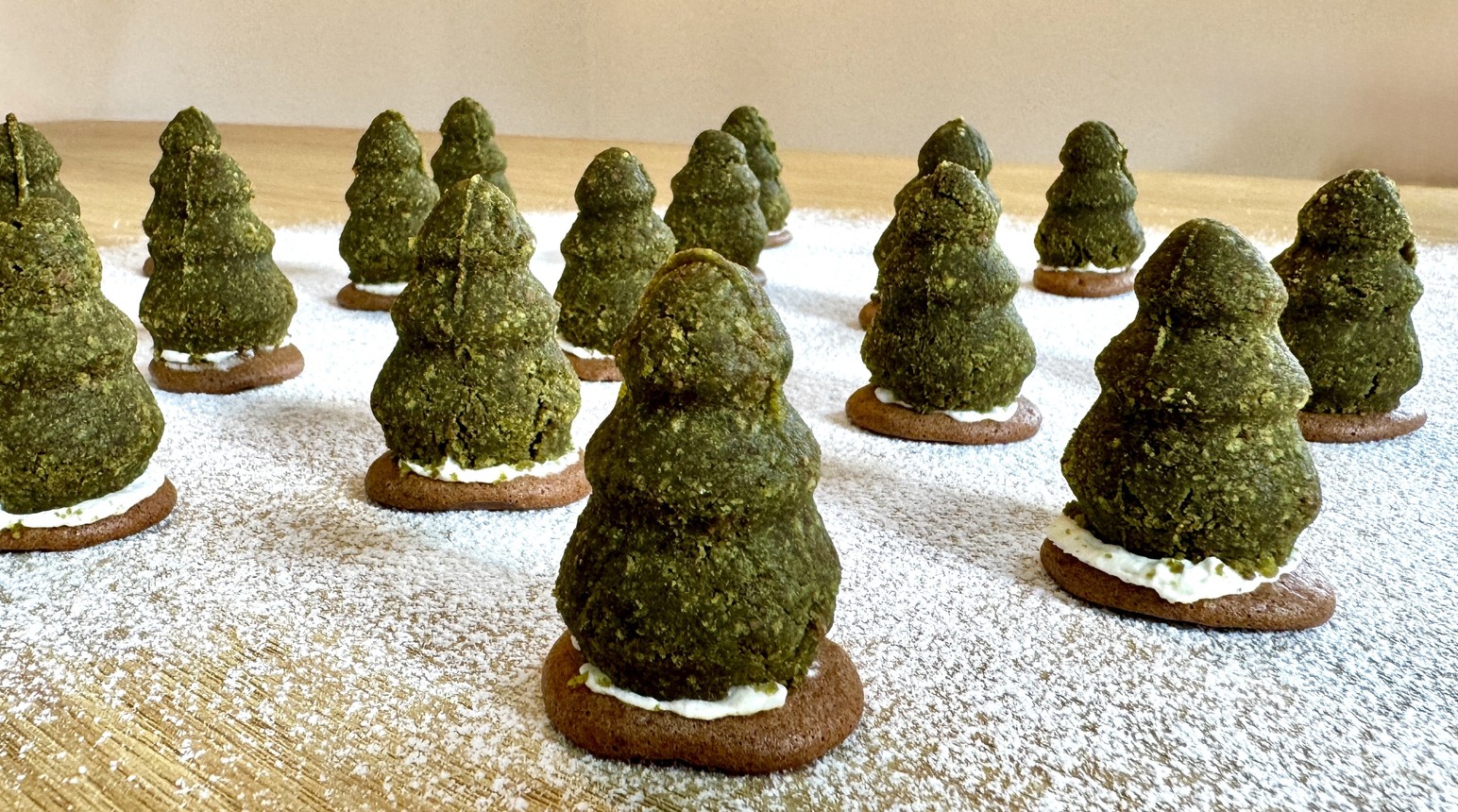 Nyní si připravíme krém. Z mléka a pudinkového prášku uvaříme hustý pudink. Necháme vychladnout, občas mícháme, aby se nevytvořil škraloup. Máslo s cukrem vyšleháme a po lžících zašleháváme vychladlý pudink. Nakonec zašleháme rum. Poté dáme do cukrářského sáčku. Formičku na stromeček můžeme vysypat moučkovým cukrem a těsto do ní po malých kouscích vytlačujeme. Uprostřed uděláme otvor, díky němuž bude stromeček dutý, ale celistvý. Stromeček naplníme připraveným krémem. Nakonec naplněný stromeček posadíme na piškot a v chladnu jej necháme do druhého dne zatuhnout.