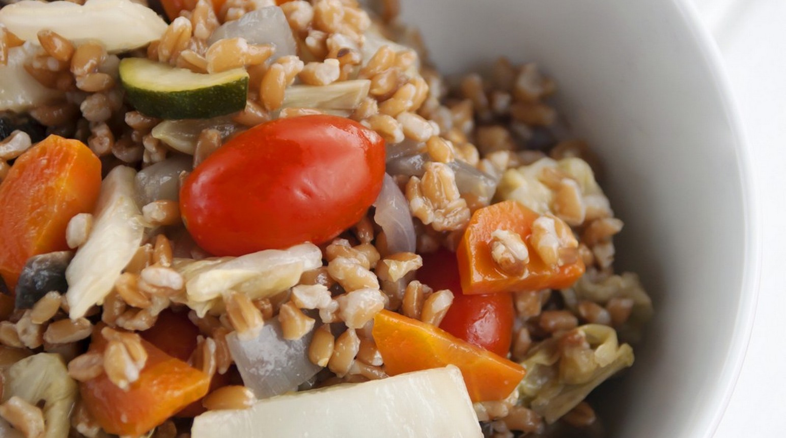Smíchejte dvouzrnku se zeleninou, posypte kostičkami sýra a čerstvou pažitkou. Dochuťte pepřem, solí a případně balzamikovým octem.