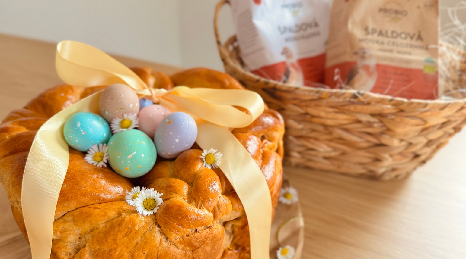 Vykynuté těsto znovu prohněteme na pomoučené ploše a rozdělíme ho na větší a menší část, určenou ke zdobení. Z velké části upleteme cop, ze kterého stočíme základ pasky. Z malé části můžeme splést dva drobnější copy, které umístíme nahoru na ozdobu.
