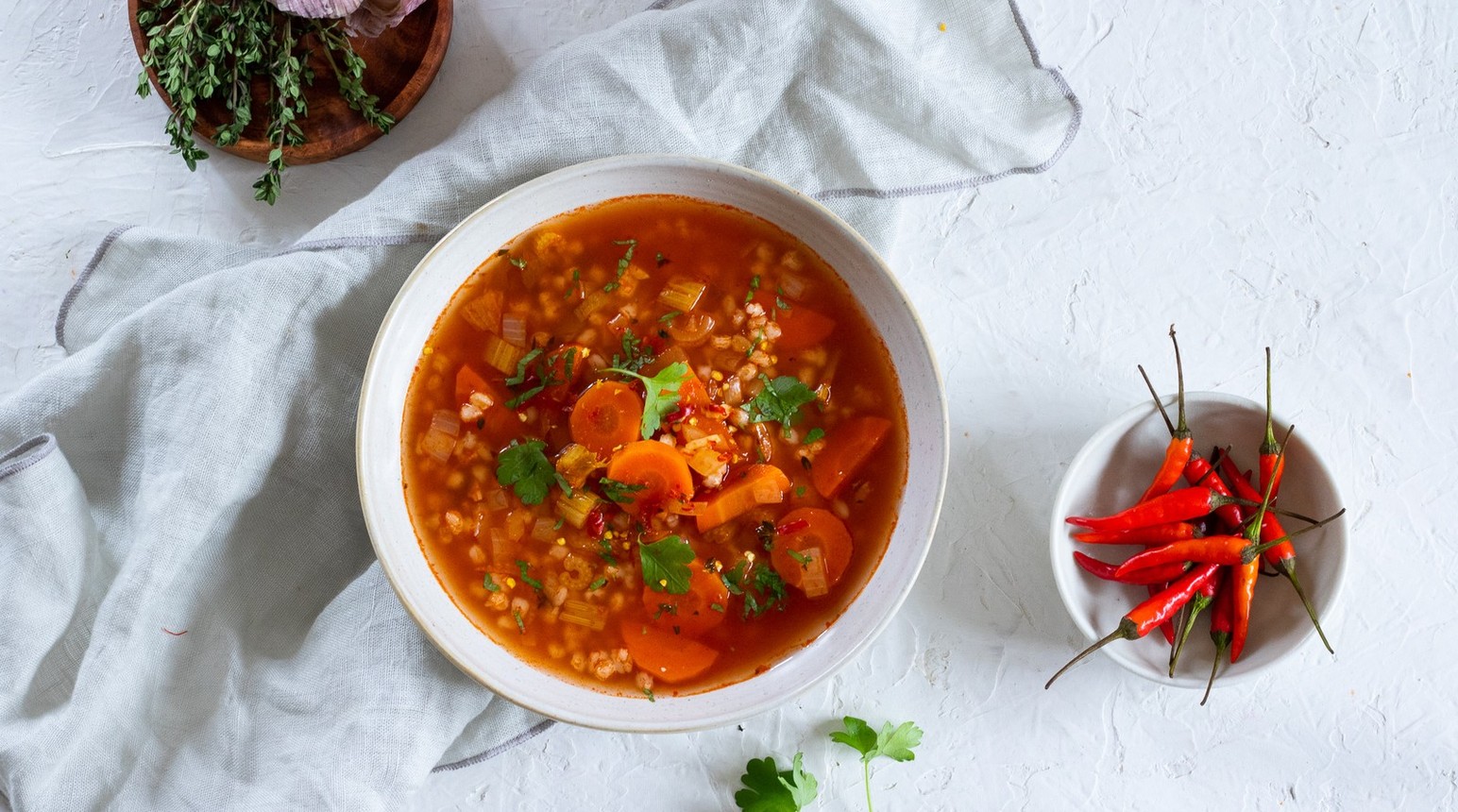 Zalijte 1 litrem vody nebo zeleninového vývaru. Osolte, opepřete a přidejte tymián. Vařte, dokud zelenina nezměkne. Nakonec do polévky vložte uvařené kroupy.
