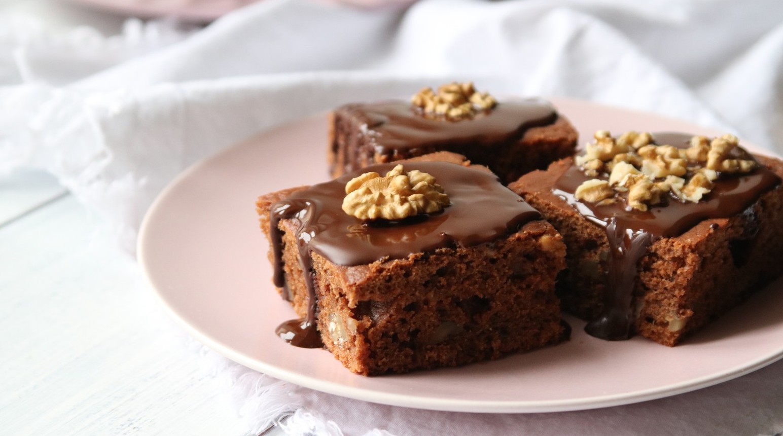 Perník polijte rozpuštěnou čokoládou a ozdobte ořechy.